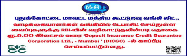 புதுக்கோட்டை மாவட்ட மத்தியக்கூட்டுறவு வங்கியில் டெபாசிட் வைப்புகளுக்கு காப்பீட்டு வசதி செய்யப்பட்டுள்ளது